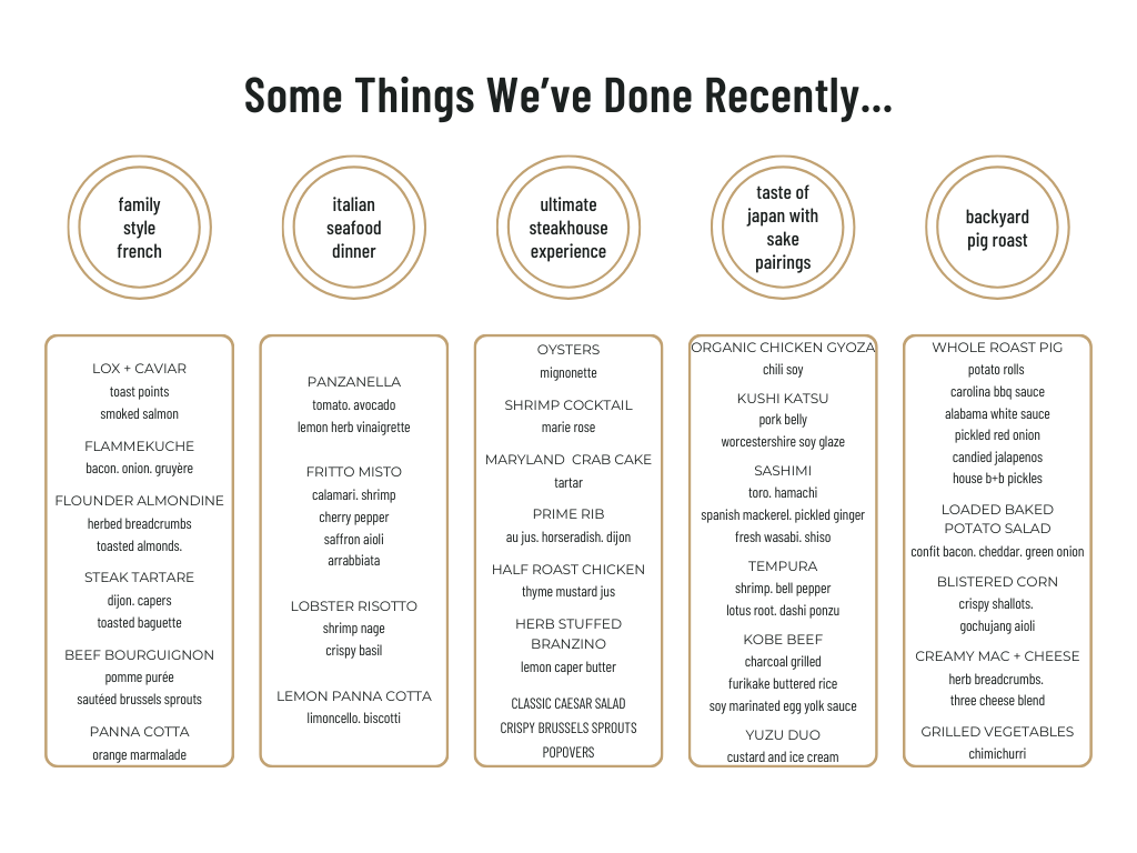 We believe in curating custom offerings to fulfill your needs, vision, and tastes. Our accomplished team brings together a collected mastery of cuisines from around the world and a shared dedication to creating bespoke menus with the best local and seasonal ingredients available.